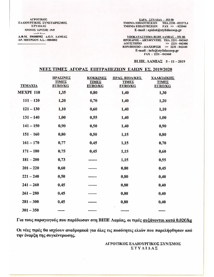 Νέες τιμές για τις πράσινες ελιές που θα ισχύσουν αναδρομικά για όλες τις ποσότητες που παρελήφθησαν από την έναρξη της συγκέντρωσης ανακοίνωσε ο Αγροτικός Συνεταιρισμός Στυλίδας.