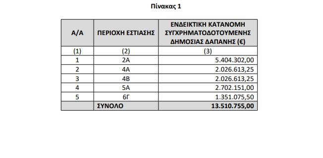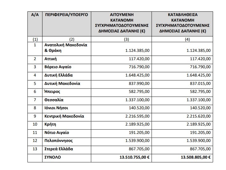 Η συνολική χρηματοδότηση των 13.510.755 ευρώ θα κατανεμηθεί ανά περιοχή και περιφέρεια, όπως έχει οριστεί από τις αρμόδιες αρχές.