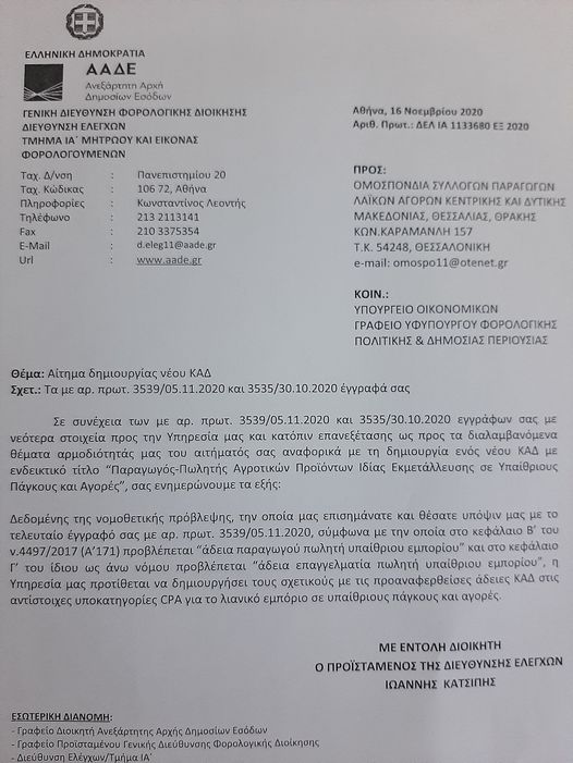 Αποδεκτό έκανε η Ανεξάρτητη Αρχή Δημοσίων Εσοδών (ΑΑΔΕ) το αίτημα της Ομοσπονδία Συλλόγων Παραγωγών Λαϊκών Αγορών Κεντρικής & Δυτικής Μακεδονίας Θεσσαλίας & Θράκης, για δημιουργία ενός εξ’ ολοκλήρου αγροτικού κωδικού αριθμού δραστηριότητας (ΚΑΔ) με ενδεικτικό τίτλο «παράγωγος πωλητής αγροτικών προϊόντων ιδίας εκμετάλλευσης σε υπαίθριους πάγκους και αγορές».