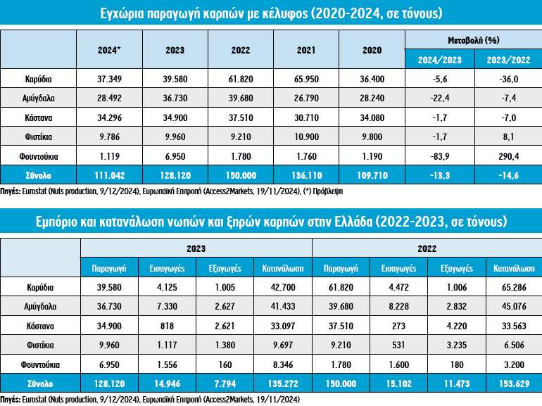 Η εγχώρια παραγωγή καρπών με κέλυφος, μετά τη σημαντική άνοδό της κατά το 2022, περιορίστηκε το 2023 σε 128 χιλ. τόνους, παρουσιάζοντας σημαντική μείωση (-14,6%), κυρίως εξαιτίας των δυσμενών καιρικών συνθηκών που ενέσκηψαν στις καλλιέργειες. Η πτώση ήταν ιδιαίτερα έντονη στα καρύδια, ο όγκος των οποίων περιορίστηκε σε 39,6 χιλ. τόνους (-36%) και ηπιότερη στα αμύγδαλα και στα κάστανα (-7,4% και -7% αντίστοιχα).