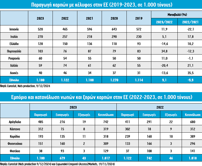 Σημαντική, επίσης, ήταν η αύξηση της παραγωγής στα φουντούκια, που ανήλθε σε 151 χιλ. τόνους (+13,4%), ενώ μικρή άνοδο σημείωσε η παραγωγή κάστανων, ανερχόμενη σε 312 χιλ. τόνους (+3%). Αντίθετα, πτώση παρουσίασε η παραγωγή καρυδιών, ο όγκος των οποίων περιορίστηκε σε 193 χιλ. τόνους (-19%), ενώ σε χαμηλό επίπεδο διατηρήθηκε η παραγωγή φιστικιών, ανερχόμενη το 2023 σε 38 χιλ. τόνους. Η κατανάλωση νωπών και ξηρών καρπών στην ΕΕ διατηρήθηκε το 2023 σε 1,818 εκατ. τόνους, επίπεδο σχεδόν παρόμοιο με το αντίστοιχο του προηγούμενου έτους, καλυπτόμενη, κατά το μεγαλύτερο μέρος της, από εισαγωγές (37% του όγκου). Ωστόσο, οι εισαγωγές περιορίστηκαν το 2023 σε 679 χιλ. τόνους, αξίας 3,32 δισ. ευρώ, παρουσιάζοντας πτώση ως προς τον όγκο και την αξία (-8,4% και -15,6% αντίστοιχα), κυρίως εξαιτίας της εξασθένισης της ζήτησης, ως συνέπεια των επιπτώσεων του πληθωρισμού στο εισόδημα των νοικοκυριών.