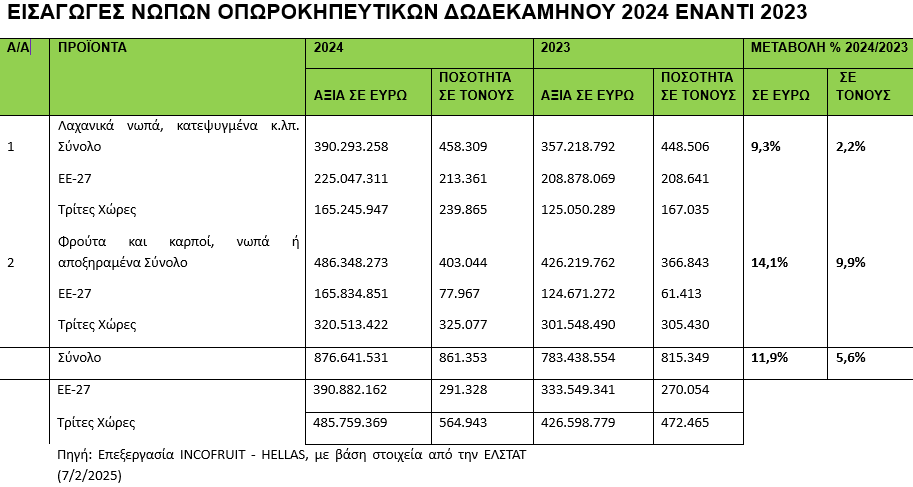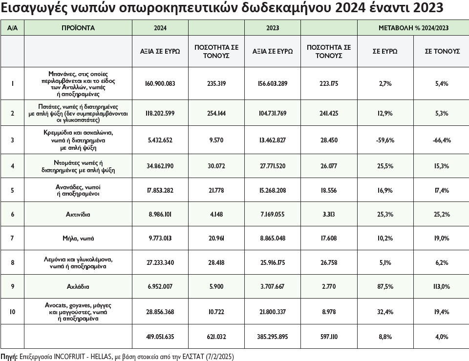 Σύμφωνα με τους πίνακες που επεξεργάστηκε για την «ΥΧ» ο Incofruit Hellas, oι μπανάνες εισήχθησαν από τον Ισημερινό, την Κολομβία και την Κόστα Ρίκα. Τα λεμόνια εισάγονται, κυρίως, από τη Νότια Αφρική, την Αργεντινή και την Αίγυπτο, ενώ τα μήλα από τη Βόρεια Μακεδονία, την Πολωνία και την Ιταλία. Άλλα εξωτικά φρούτα προέρχονται από άλλες χώρες της ΕΕ, όπως Ιταλία, Ολλανδία, Γαλλία και Γερμανία. «Αυτές οι χώρες προμηθεύουν τα εν λόγω προϊόντα, επανεξάγοντάς τα από εισαγωγές τους από τις χώρες προέλευσής τους. Τα σημαντικότερα λαχανικά που εισάγονται από τρίτες χώρες είναι πατάτες, ντομάτες, κρεμμύδια και σκόρδα. Η Τουρκία είναι ο σημαντικός προμηθευτής των ντοματών και η Αυστρία των κρεμμυδιών. Η Αίγυπτος, η Κύπρος και η Γαλλία είναι οι κυριότερες χώρες προέλευσης των εισαγωγών πατατών», μας αναφέρει ο ειδικός σύμβουλος του Incofruit Hellas, Γιώργος Πολυχρονάκης.