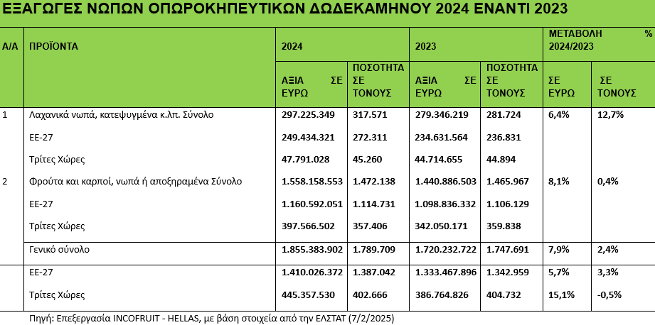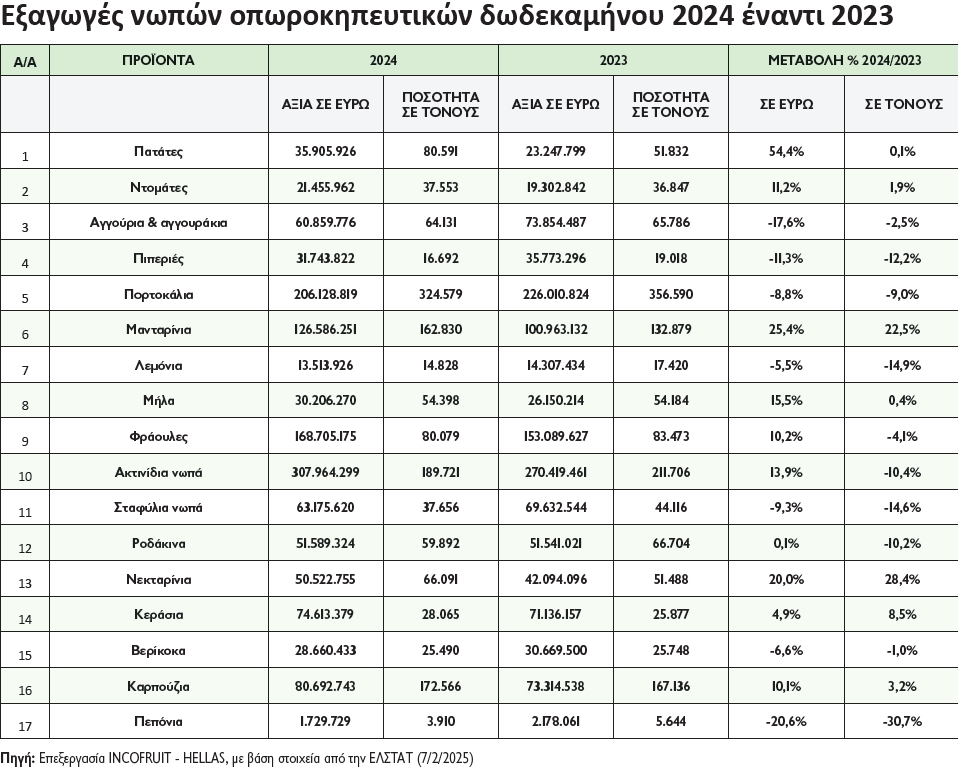 Σύμφωνα με τα ίδια στοιχεία, που επεξεργάστηκε ο Σύνδεσμος Επιχειρήσεων Εξαγωγής, Διακίνησης Φρούτων, Λαχανικών και Χυμών – Incofruit Hellas για την «ΥΧ», η χώρα μας εξάγει μια ευρεία ποικιλία, όπως τα ακτινίδια, οι φράουλες, τα πορτοκάλια, τα πυρηνόκαρπα, τα καρπούζια, τα μανταρινοειδή και τα σταφύλια, ενώ τα κύρια εξαγόμενα λαχανικά είναι το σπαράγγι, τα αγγούρια, οι πιπεριές και οι ντομάτες.