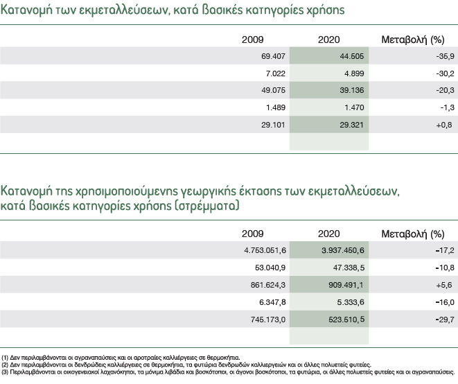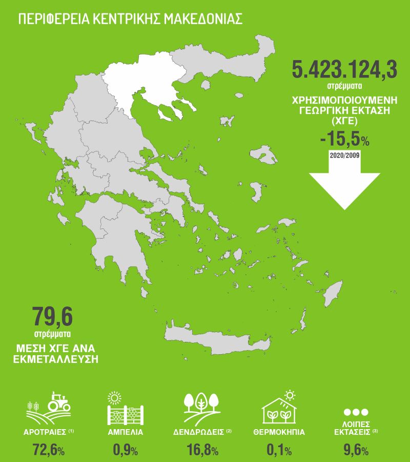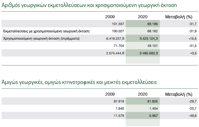 Η συνολικά χρησιμοποιούμενη γεωργική έκταση (ΧΓΕ) ανέρχεται σε 5.423.124,3 στρέμματα, σημειώνοντας μείωση της τάξεως του -15,5% σε σύγκριση με το 2009. Παράλληλα, ο αριθμός γεωργικών εκμεταλλεύσεων παρουσίασε δραματική πτώση κατά -31,7%, από 101.337 σε 69.356 μονάδες. Η μείωση ήταν ανάλογη και στις εκμεταλλεύσεις με αρδευόμενες εκτάσεις, οι οποίες συρρικνώθηκαν κατά -31,5%.