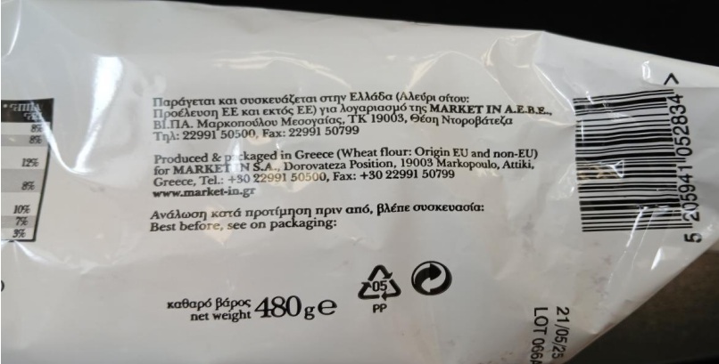 Ο Ε.Φ.Ε.Τ. και ειδικότερα η Περιφερειακή Διεύθυνση Δυτικής Ελλάδας, στο πλαίσιο του Προγράμματος «Επίσημος Έλεγχος για την Παρακολούθηση των Επιπέδων Προσθέτων Τροφίμων και Αρωματικών Ουσιών σε Τρόφιμα», προέβη σε δειγματοληψία τροφίμου με τα στοιχεία: “Τσουρέκι με γέμιση πραλίνα φουντουκιού – μικρές φάρμες του βουνού” με ημερομηνία ανάλωσης κατά προτίμηση πριν από τις 21/05/25 και αριθμό παρτίδας Lot 066A1, συσκευασίας καθαρού βάρους 480g, το οποίο παράγεται και συσκευάζεται στην Ελλάδα για λογαριασμό της ΜΑΡΚΕΤ ΙΝ Α.Ε.Β.Ε. που εδρεύει στην ΒΙ.ΠΑ. Μαρκοπούλου Μεσογαίας.