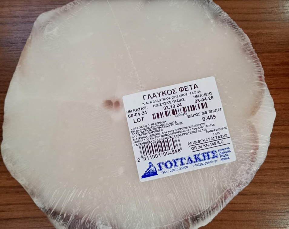 πλαίσιο του Προγράμματος «Επίσημος έλεγχος για την παρακολούθηση χημικών παραμέτρων Ασφάλειας Τροφίμων- Έλεγχος για τον προσδιορισμό μετάλλων σε τρόφιμα» έτους 2025, προέβη σε δειγματοληψία ΓΛΑΥΚΟΣ ΦΕΤΑ ΚΑΤΕΨΥΓΜΕΝΟΣ, Κ.Α. Ατλαντικός Ωκεανός FAO 34, χώρα παραγωγής Ισπανίας, με ημερομηνία κατάψυξης 08-04-24, ημερομηνία συσκευασίας 02-10-24, ημερομηνία ανάλωσης 08-04-26 και αριθμό παρτίδας LOT 49930924 που παράγεται από την επιχείρηση ΓΟΓΓΑΚΗΣ Α.Ε.Β.Ε.