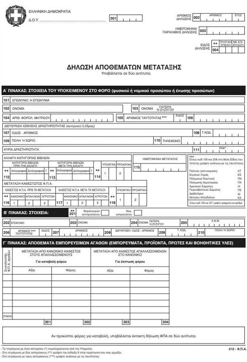 Ο λόγος για τη Δήλωση των Αποθεμάτων Μετάταξης, η οποία υποβάλλεται εντός δύο μηνών από την έναρξη του φορολογικού έτους στο οποίο πραγματοποιείται η μετάταξη. Το σχετικό έντυπο είναι αυτό που έχει οριστεί με την ΠΟΛ.1199/2016 και ισχύει για δηλώσεις που υποβάλλονται από το φορολογικό έτος 2017 κι εφεξής, ακόμα και αν αφορούν πράξεις προηγούμενων φορολογικών ετών.