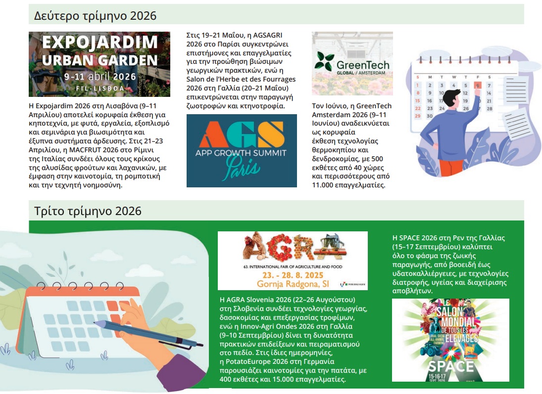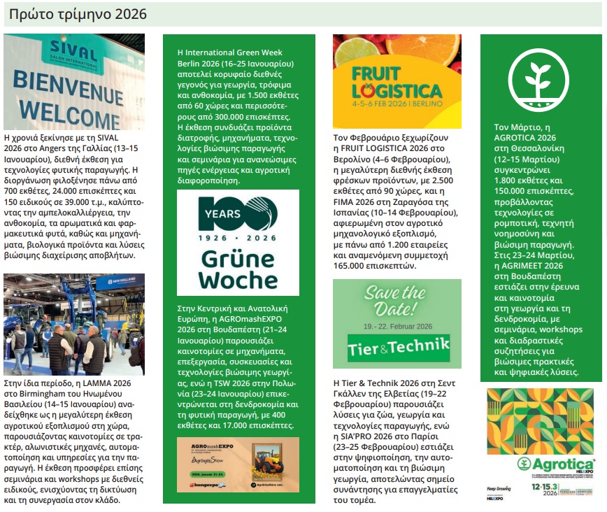 Το 2026 αναμένεται να είναι μια χρονιά γεμάτη σημαντικές αγροτικές εκδηλώσεις στην Ευρώπη, όπου επαγγελματίες, παραγωγοί και επιχειρηματίες θα έχουν την ευκαιρία να ανταλλάξουν γνώση, να παρουσιάσουν καινοτομίες και να ενισχύσουν τη συνεργασία σε διεθνές επίπεδο. Από τις τεχνολογίες παραγωγής έως τη βιώσιμη γεωργία και την αγροτική καινοτομία, οι εκθέσεις θα προσφέρουν ένα πλήρες πεδίο συζήτησης για τα μείζονα ζητήματα του κλάδου, όπως η κλιματική αλλαγή, η ασφάλεια τροφίμων και η οικονομική βιωσιμότητα.