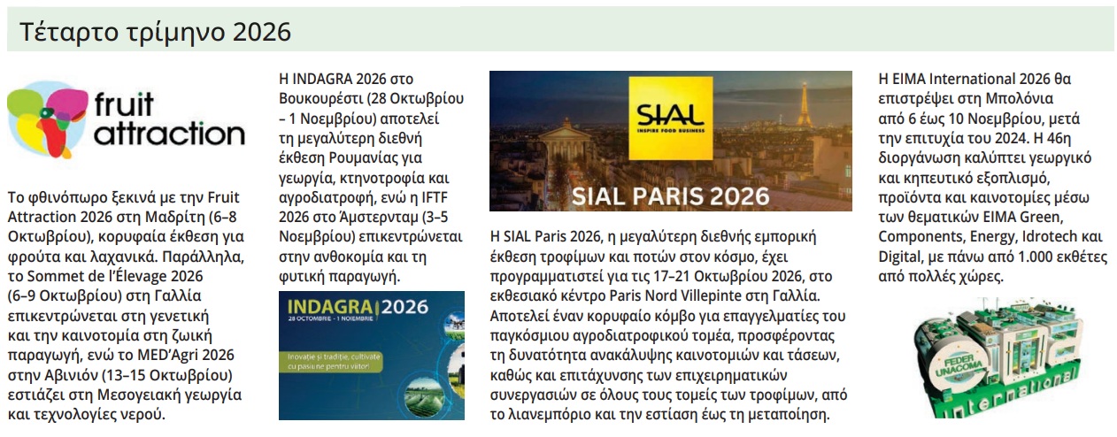 Το 2026 αναμένεται να είναι μια χρονιά γεμάτη σημαντικές αγροτικές εκδηλώσεις στην Ευρώπη, όπου επαγγελματίες, παραγωγοί και επιχειρηματίες θα έχουν την ευκαιρία να ανταλλάξουν γνώση, να παρουσιάσουν καινοτομίες και να ενισχύσουν τη συνεργασία σε διεθνές επίπεδο. Από τις τεχνολογίες παραγωγής έως τη βιώσιμη γεωργία και την αγροτική καινοτομία, οι εκθέσεις θα προσφέρουν ένα πλήρες πεδίο συζήτησης για τα μείζονα ζητήματα του κλάδου, όπως η κλιματική αλλαγή, η ασφάλεια τροφίμων και η οικονομική βιωσιμότητα.