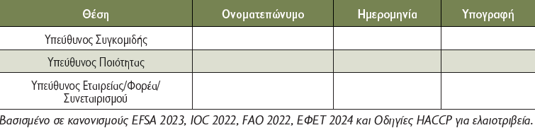 - Συνεργασία με πιστοποιημένα ελαιοτριβεία που διαθέτουν HACCP/ISO 22000.