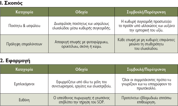 Το πρωτόκολλο εφαρμόζεται από όλα τα μέλη της εταιρείας/του φορέα/του συνεταιρισμού, τους εργάτες συγκομιδής και τα ελαιοτριβεία που συνεργάζονται με τον συνεταιρισμό. Η ευθύνη εφαρμογής επιβεβαιώνεται από τον υπεύθυνο παραγωγής ή τον γεωπόνο του συνεταιρισμού.