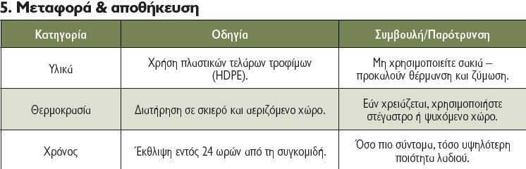 - Μεταφορά σε πλαστικά τελάρα HDPE τροφίμων, όχι σε σακιά ή μεταλλικά δοχεία.