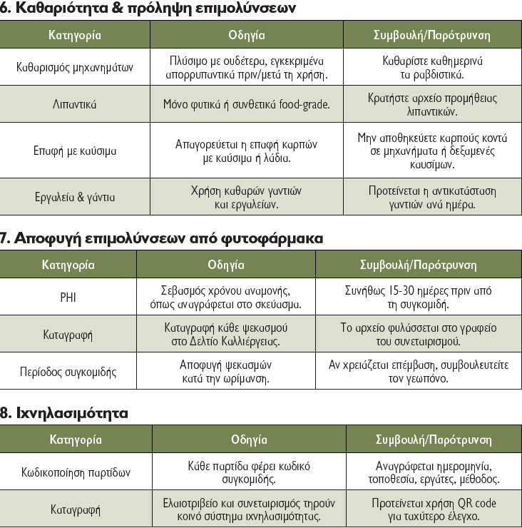 - Χρήση καθαρών γαντιών ή εργαλείων κατά τον χειρισμό των καρπών.