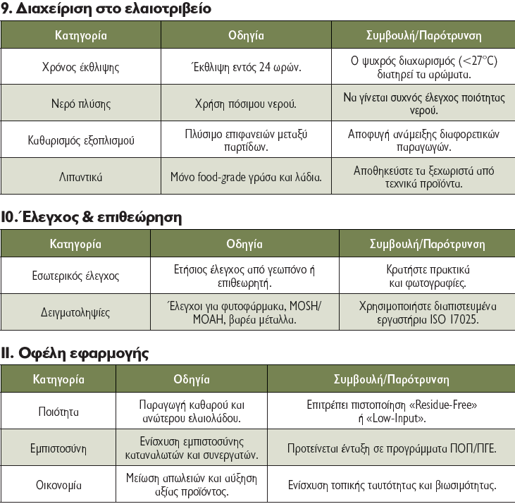 - Άμεση μεταφορά στο ελαιοτριβείο εντός 24 ωρών από τη συγκομιδή.
