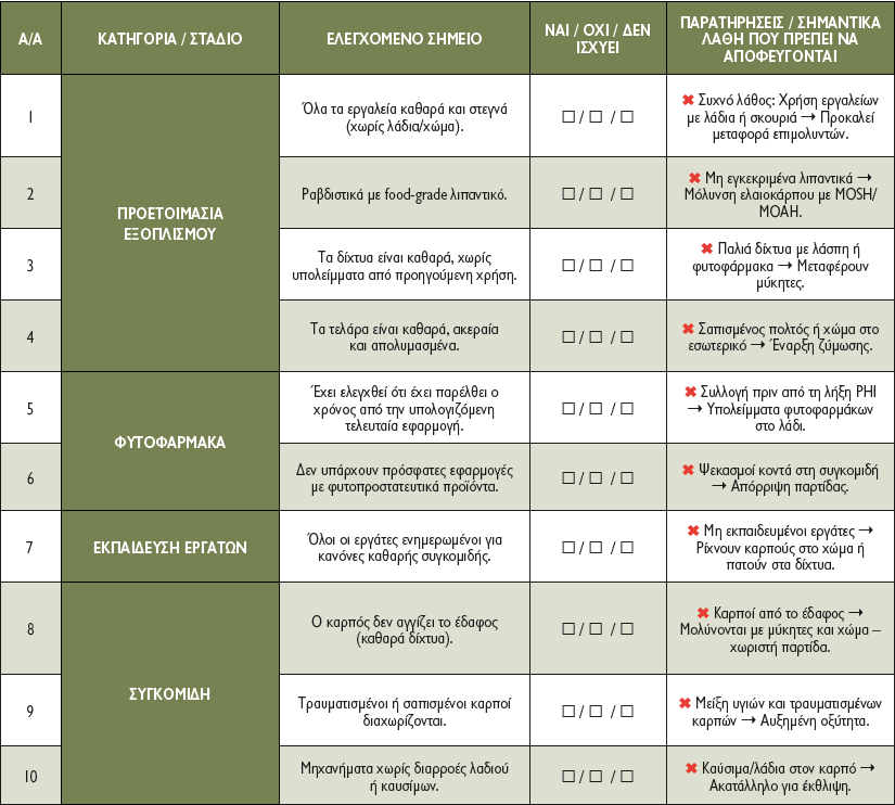 Checklist ημερήσιου ελέγχου για μια «καθαρή» συγκομιδή