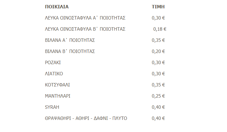 Όσο αφορά τα ποικιλιακά οινοστάφυλα που δεν περιλαμβάνονται στον παραπάνω πίνακα (π.χ. Μαλβαζία, Βιδιανό), θα παραλαμβάνονται μόνο μετά από επιτόπιο ποιοτικό έλεγχο από τον αρμόδιο γεωπόνο όπου θα καθορίζεται και η τιμή τους.