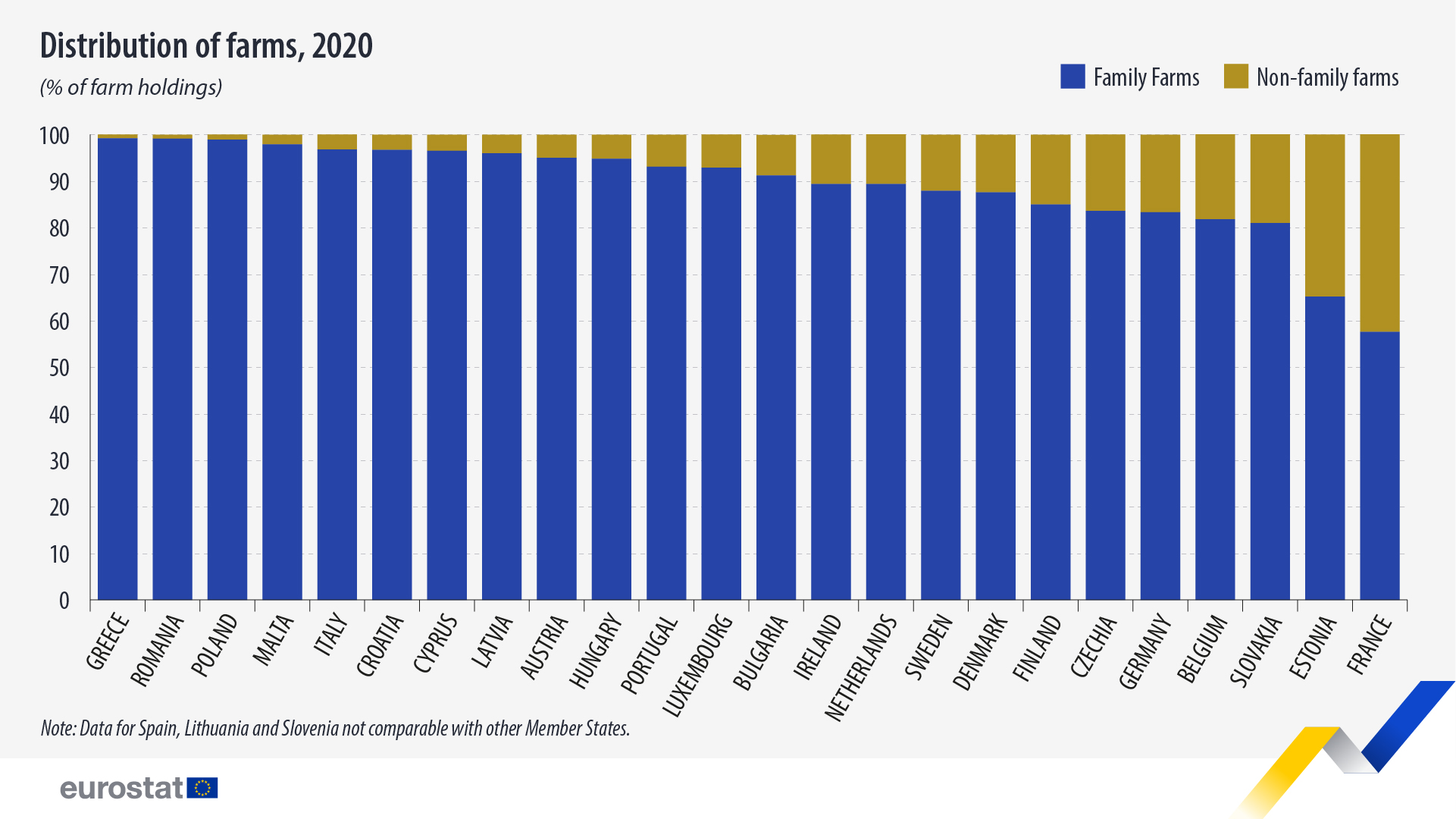 Οι οικογενειακές εκμεταλλεύσεις αντιπροσώπευαν τουλάχιστον το 80% όλων των εκμεταλλεύσεων σε όλες τις χώρες της ΕΕ, εκτός από την Εσθονία (65%) και τη Γαλλία (58%). Οι χώρες της ΕΕ με τα υψηλότερα μερίδια οικογενειακών εκμεταλλεύσεων ήταν η Ελλάδα, η Ρουμανία και η Πολωνία (όλες με μερίδιο περίπου 99% όλων των εκμεταλλεύσεων).