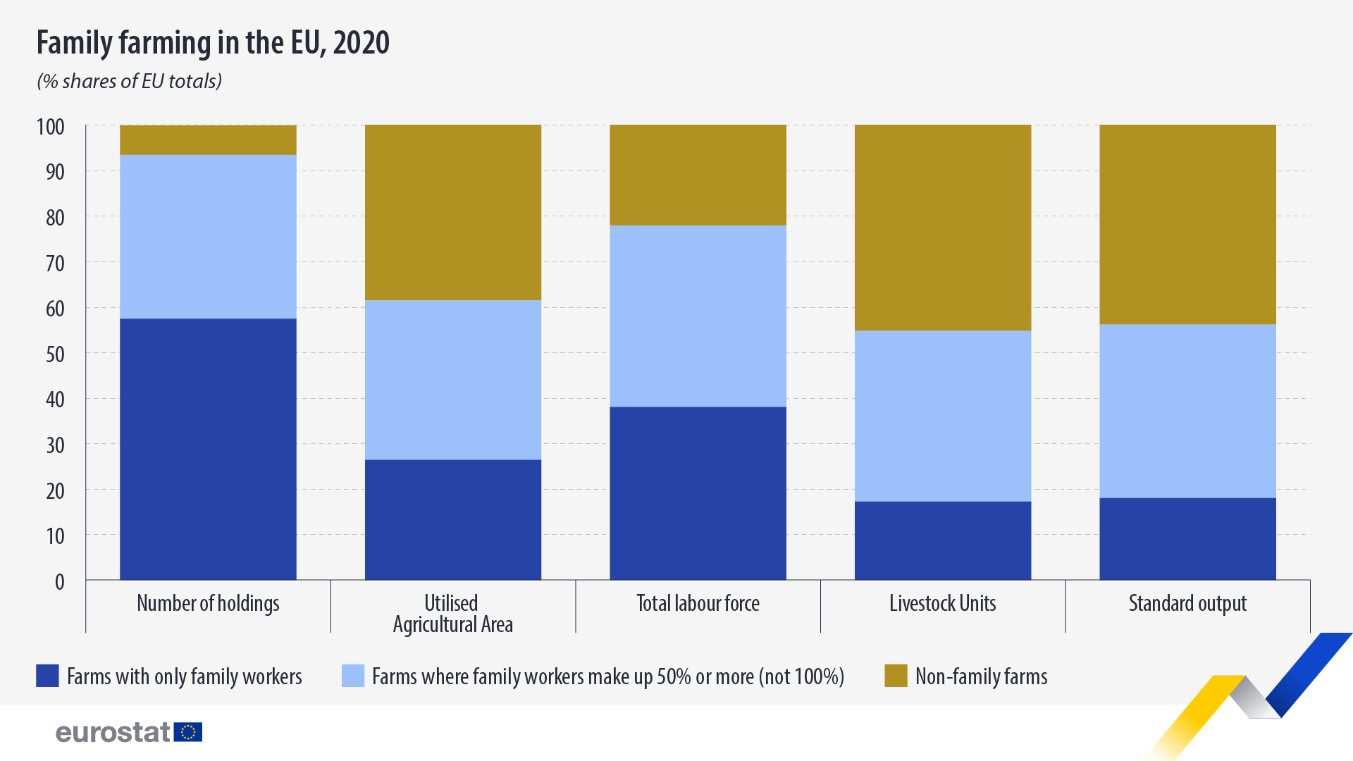 Αν και οι μη οικογενειακές εκμεταλλεύσεις αντιπροσώπευαν περίπου μόνο το 7% όλων των εκμεταλλεύσεων στην ΕΕ το 2020, αντιπροσώπευαν πολύ υψηλότερα μερίδια της γης που χρησιμοποιήθηκε για τη γεωργική παραγωγή (περίπου 39%), του συνολικού εργατικού δυναμικού (περίπου 22%) , των κτηνοτροφικών μονάδων (περίπου 45%) και της τυπικής παραγωγής (περίπου 44%).