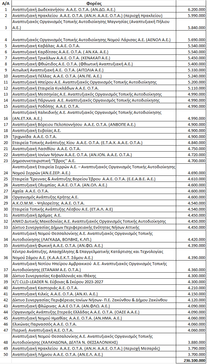 Ακολουθεί ο πίνακας με τα ακριβή ποσά ανά Αναπτυξιακή