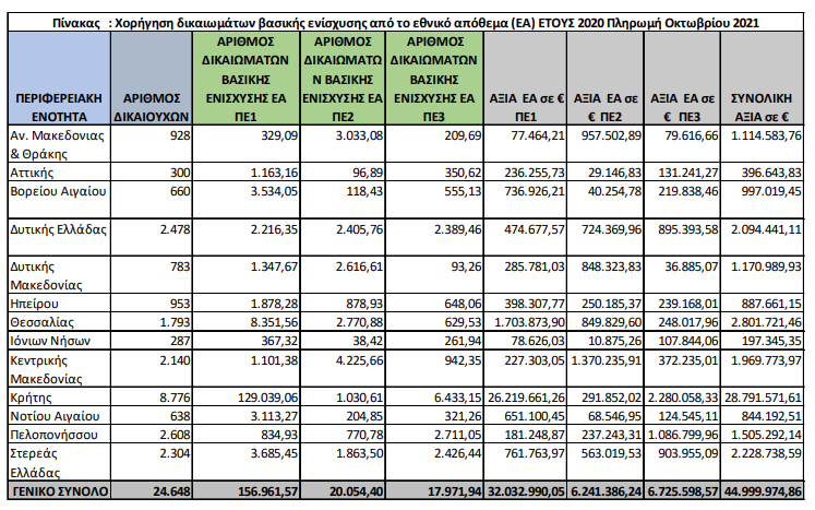 Όπως ανακοίνωσε ο ΟΠΕΚΕΠΕ για το 2020 χορηγήθηκαν δικαιώματα εθνικού αποθέματος ύψους 44.999.974,86 ευρώ σε 24.648 δικαιούχους.