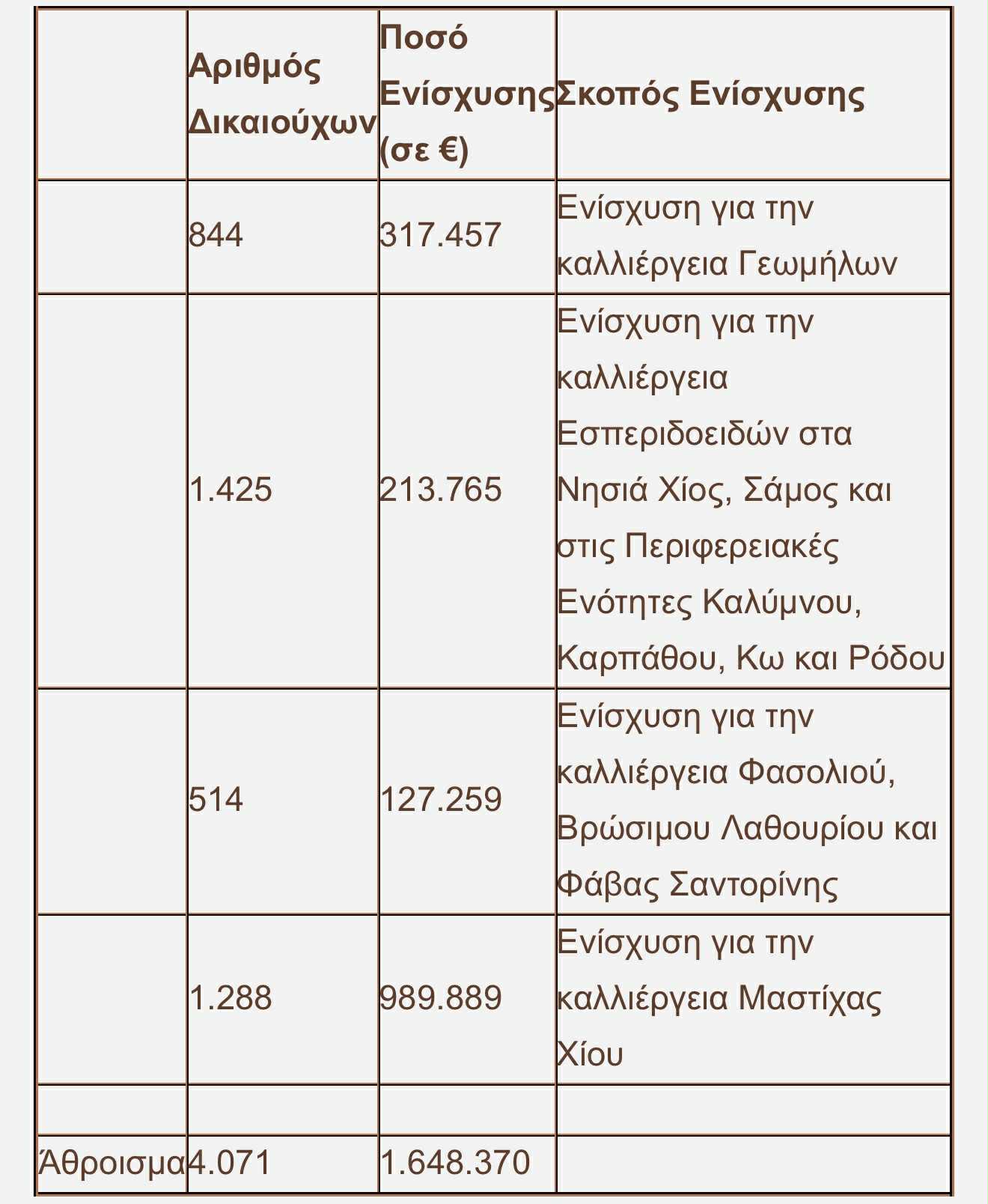 Οι ενισχύσεις αφορούν κυρίως ειδικά καθεστώτα καλλιεργειών, με τα ακόλουθα ποσά ανά δράση: