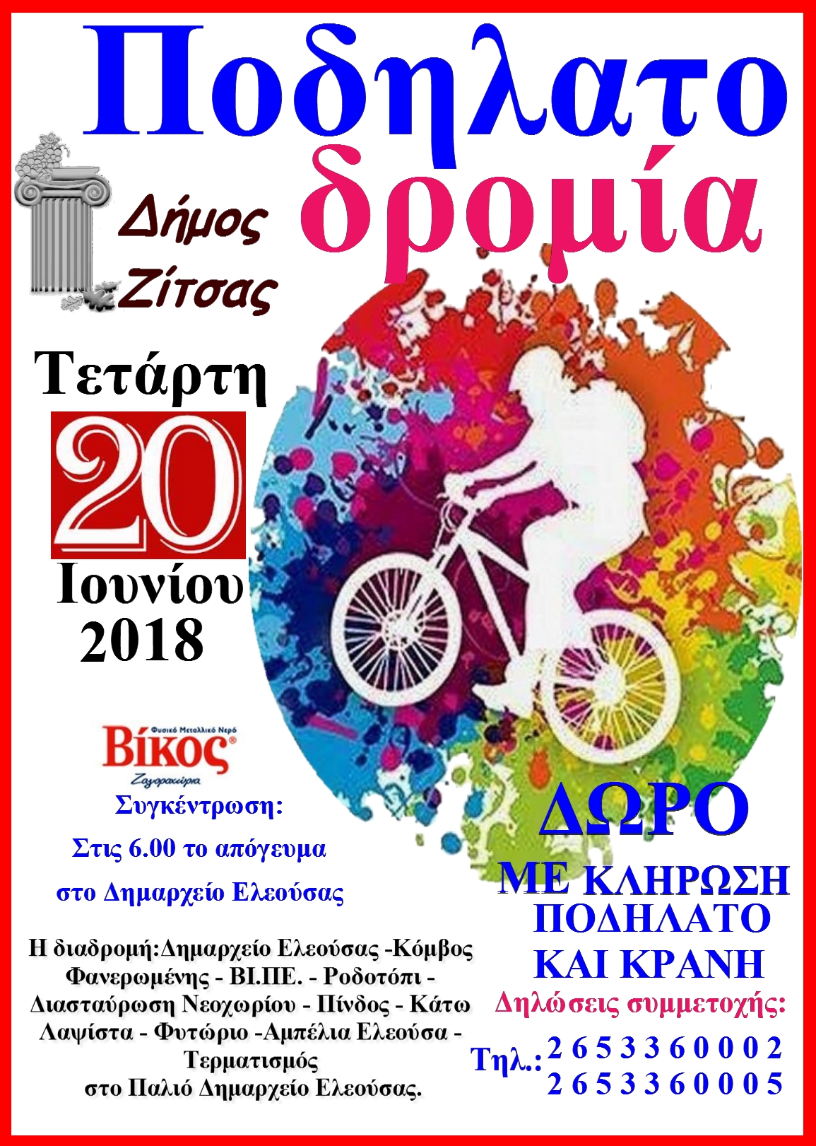 Η ποδηλατοδρομία προγραμματίζεται για την Τετάρτη 20 Ιουνίου στις 6.00 το απόγευμα με αφετηρία το Δημαρχείο (Λ. Πασσαρώνος) και τερματισμό την πλατεία του παλιού Δημαρχείου στην Ελεούσα. Η διαδρομή είναι περίπου 22χλμ και απευθύνεται σε πολίτες όλων των ηλικιών που αγαπούν τις βόλτες με το ποδήλατο. Στόχος, πέρα από την άθληση και ψυχαγωγία είναι η αναβάθμιση του κοινωνικού ρόλου του αθλητισμού καθώς και η ενθάρρυνση και ευαισθητοποίηση της χρήσης ποδηλάτου ως μέσου Βιώσιμης Αστικής Κινητικότητας.