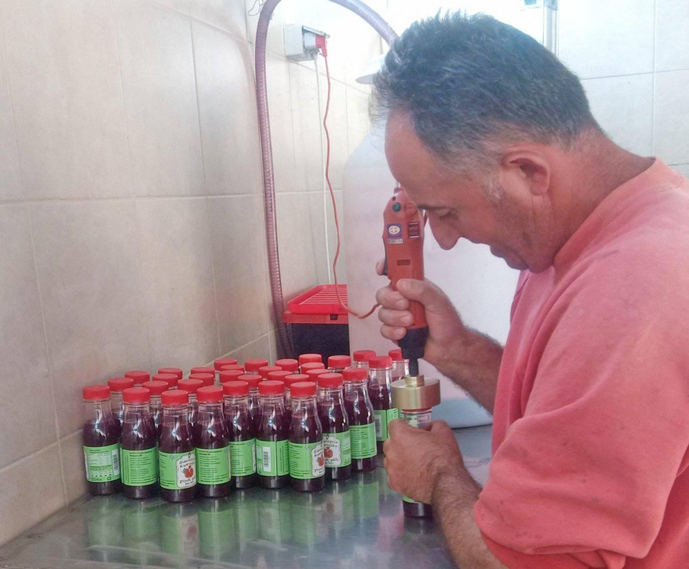 Για τις δυσκολίες του χώρου και τον τρόπο παραγωγής και διάθεσης των χυμών ροδιού, μας λέει: «Εγώ και η οικογένειά μου καλλιεργούμε 5.000 δέντρα στη Χάλκη. Από το 2011, και με προτροπή του αδερφού μου, που είναι αγρότης, άρχισα να ασχολούμαι με τα κτήματα, που είχα από τον πατέρα μου και επικεντρώθηκα στις δεντροκαλλιέργειες. Πρόκειται για βιοκαλλιέργειες, όλα βιολογικά δηλαδή, ρόδια πρωτίστως, από τα οποία παράγω χυμό ροδιού. Οι άλλες καλλιέργειες είναι καρύδια και φιστίκια Αιγίνης, κι αυτά βιολογικά καλλιεργημένα.