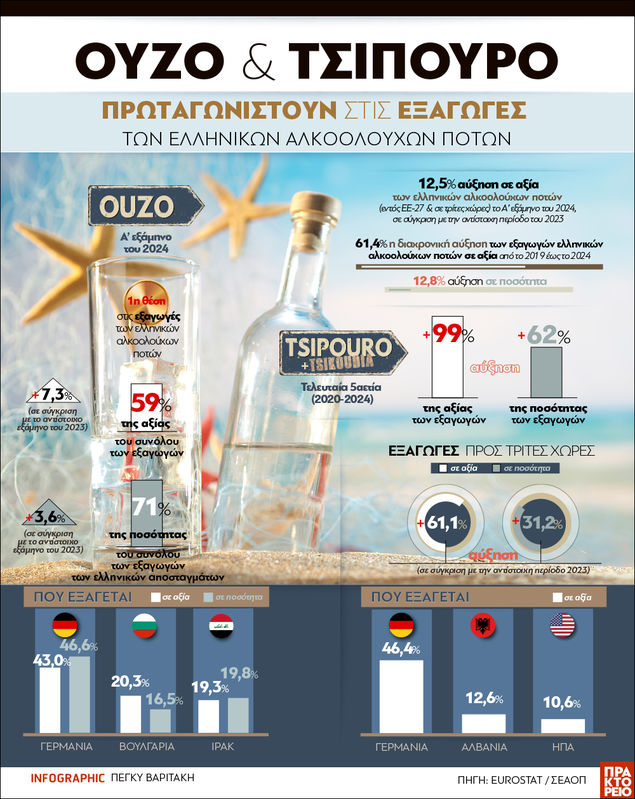 Σύμφωνα με το γράφημα τα ελληνικά αλκοολούχα ποτά σημείωσαν αύξηση σε αξία κατά 12,5% (εντός ΕΕ και σε τρίτες χώρες) το Α” εξάμηνο του 2024, σε σύγκριση με την αντίστοιχη περίοδο του 2023.