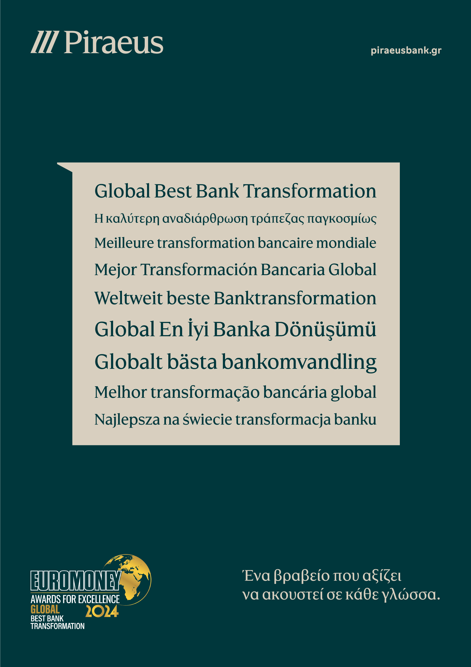 Η Πειραιώς ανακοινώνει την κατάκτηση τριών σημαντικών, διεθνών βραβείων στο πλαίσιο του θεσμού, Euromoney Awards for Excellence 2024. Στην τελετή απονομής που πραγματοποιήθηκε στις 18 Ιουλίου 2024 στο Λονδίνο, η Πειραιώς αναδείχθηκε ως η τράπεζα που πέτυχε την καλύτερη αναδιοργάνωση παγκοσμίως και της απονεμήθηκε το βραβείο “The World’s Best Bank Transformation”.