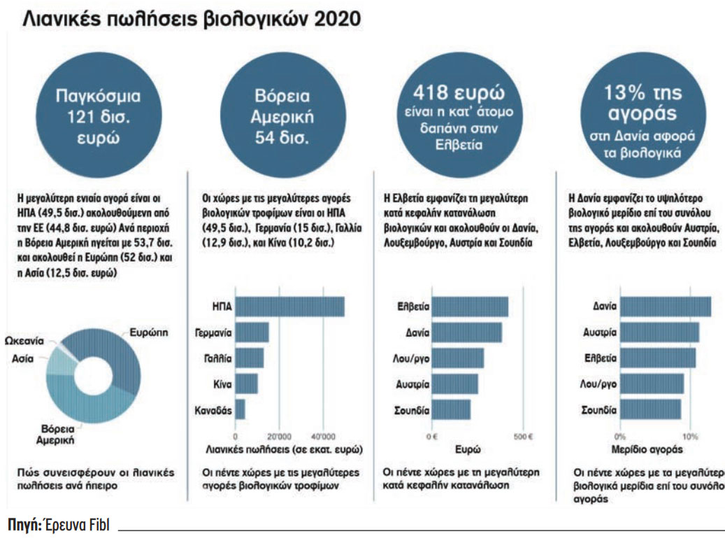 Σπάζοντας το φράγμα των 120 δισ. ευρώ, η αγορά των βιολογικών έδειξε πρωτοφανή ανάπτυξη παγκοσμίως το 2020, καθώς αυξήθηκε κατά 14 δισ. ευρώ παρά τις προκλήσεις που αποτυπώθηκαν στις λιανικές πωλήσεις στο πλαίσιο της πανδημίας. Οι ΗΠΑ (49,5 δισ.), η Γερμανία (15 δισ.) και η Γαλλία (12,7 δισ.) εξακολούθησαν να ηγούνται ως αγορές βιολογικών, αυξάνοντας τα μεγέθη τους από την προηγούμενη χρονιά.