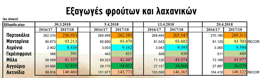 Ακόμη, με μικρότερη, πλέον, ροή συνεχίστηκαν οι εξαγωγές ακτινιδίων, φτάνοντας στις ποσότητες ρεκόρ των 149.322 τόνων, έναντι 104.418 τόνων πέρσι μέχρι την αντίστοιχη εβδομάδα, ενώ, εκτιμάται ότι συνολικά θα ξεπεράσουν τους 160.000 τόνους.