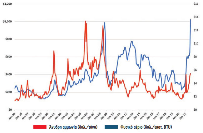Εξέλιξη τιµής άνυδρης αµµωνίας και φυσικού αερίου 1/1995 – 10/2021