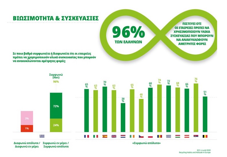 Ακόμη, τα κουτιά αλουμινίου φαίνεται να είναι η προτιμητέα συσκευασία μπίρας και αναψυκτικών για τους Έλληνες, με το 75% να τα επιλέγει επειδή ανακυκλώνονται εύκολα, σε αντίθεση με τους Ιταλούς, Πολωνούς και Σέρβους, όπου μόνο ένας στους τρεις συμφωνεί. Τέλος, η συντριπτική πλειοψηφία των συμμετεχόντων στη χώρα μας (96%) πιστεύει ότι οι εταιρείες πρέπει να χρησιμοποιούν υλικά συσκευασίας που μπορούν να ανακυκλώνονται αμέτρητες φορές.