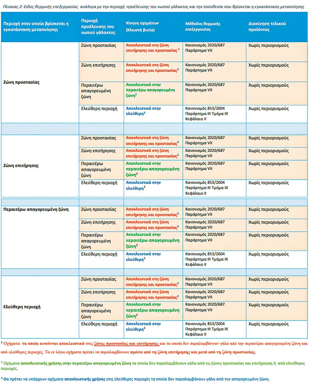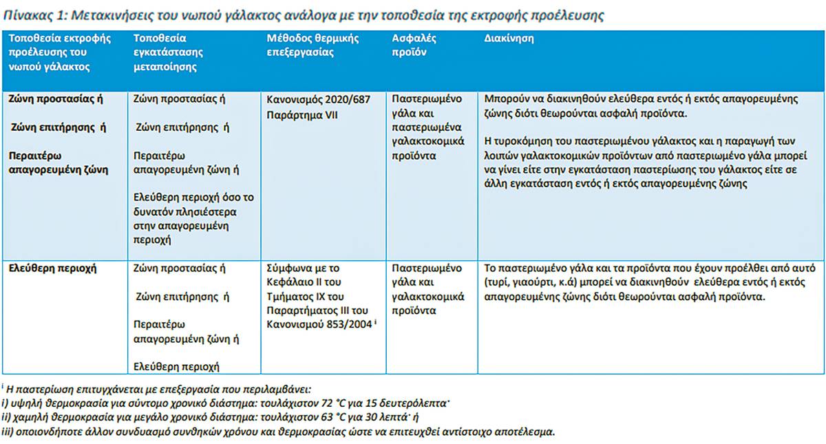 Ωστόσο, στα άρθρα 33 και 49 του εν λόγω Κανονισμού αναφέρονται οι ειδικοί όροι για την έγκριση μετακινήσεων νωπού γάλακτος που προέρχεται από εκτροφές που βρίσκονται στη ζώνη προστασίας και τη ζώνη επιτήρησης, αντίστοιχα. Το νωπό γάλα μπορεί να μετακινηθεί σε εγκατάσταση μεταποίησης γάλακτος για να υποβληθεί σε μία από τις σχετικές επεξεργασίες μετριασμού του κινδύνου, που καθορίζονται στο παράρτημα VII του Εκτελεστικού Κανονισμού 2020/687. Η μετακίνηση νωπού γάλακτος από την εκτροφή προέλευσης στην εγκατάσταση μεταποίησης πρέπει να πραγματοποιείται μέσα σε κλειστούς περιέκτες και η εγκατάσταση μεταποίησης πρέπει να βρίσκεται στην ίδια απαγορευμένη ζώνη ή όσο το δυνατόν πλησιέστερα στην απαγορευμένη ζώνη και πρέπει να λειτουργεί υπό την επιτήρηση επίσημων κτηνιάτρων.