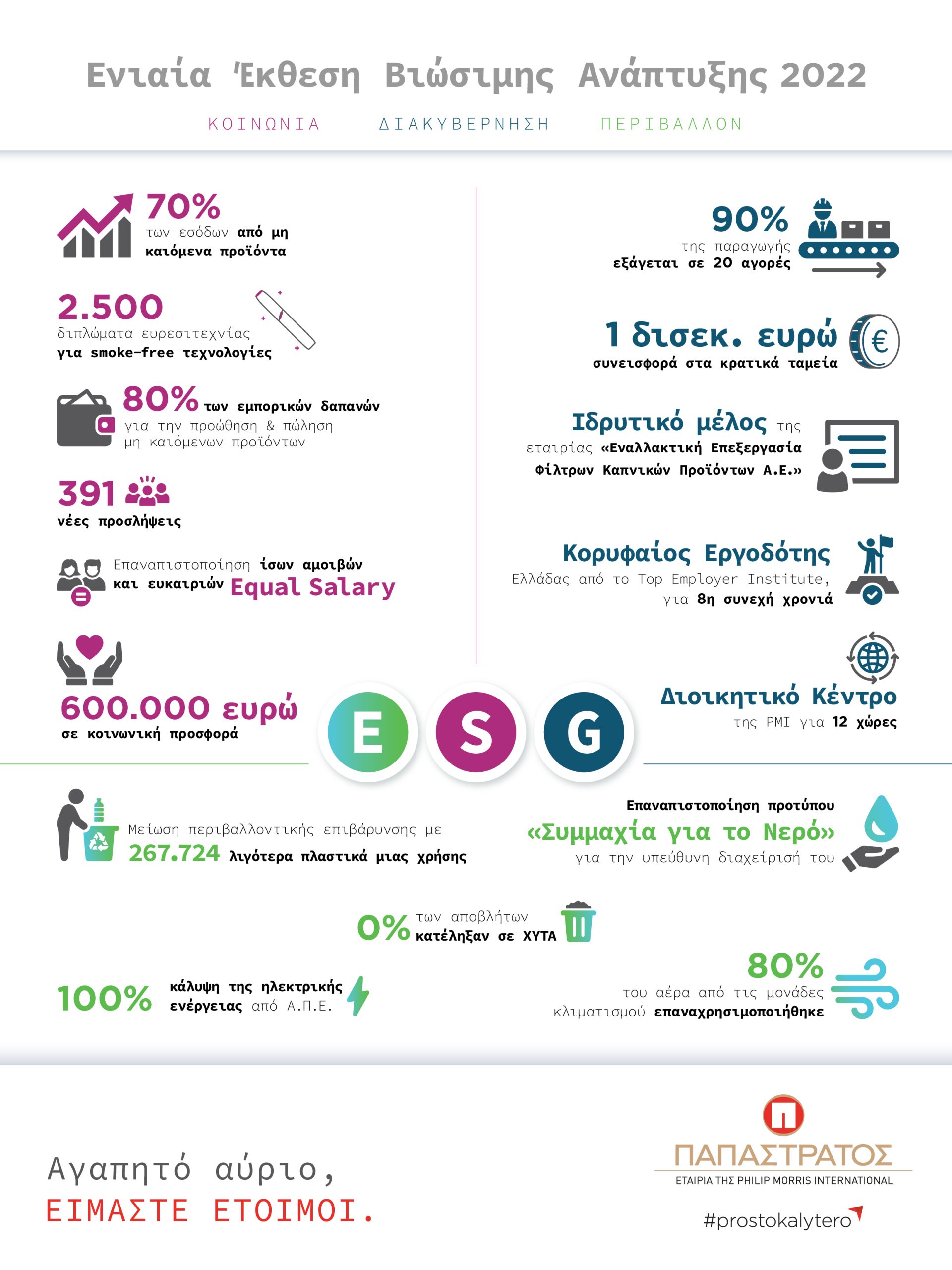 Η Παπαστράτος, με υψηλό αίσθημα ευθύνης απέναντι στην κοινωνία και το περιβάλλον, δημοσιεύει την 3η Ενιαία Έκθεση Βιώσιμης Ανάπτυξης για το 2022. Στην Έκθεση αποτυπώνονται αναλυτικά, με συγκεκριμένα αριθμητικά δεδομένα και τεκμηρίωση, οι στόχοι που υλοποίησε η εταιρεία μέσα στο 2022 καθώς και οι δείκτες απόδοσης (KPIs) της επιχειρηματικής λειτουργίας της, σε συνάρτηση με τα κριτήρια ESG (Περιβάλλον, Κοινωνία, Εταιρική Διακυβέρνηση).