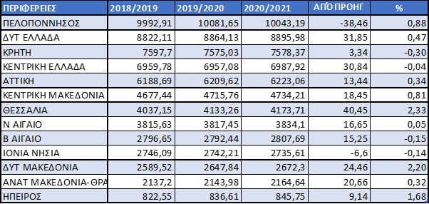 Επίσης η κατάταξη ανά έκταση των 13 Περιφερειών της χώρας, όχι μόνο καταδεικνύει τις σημαντικότερες αμπελουργικές περιφέρειες, αλλά αναδεικνύει και τις πιο δυναμικές, σύμφωνα με τα ποσοστά αύξησης των εκτάσεων τους, όπως φαίνεται στον πίνακα που ακολουθεί: