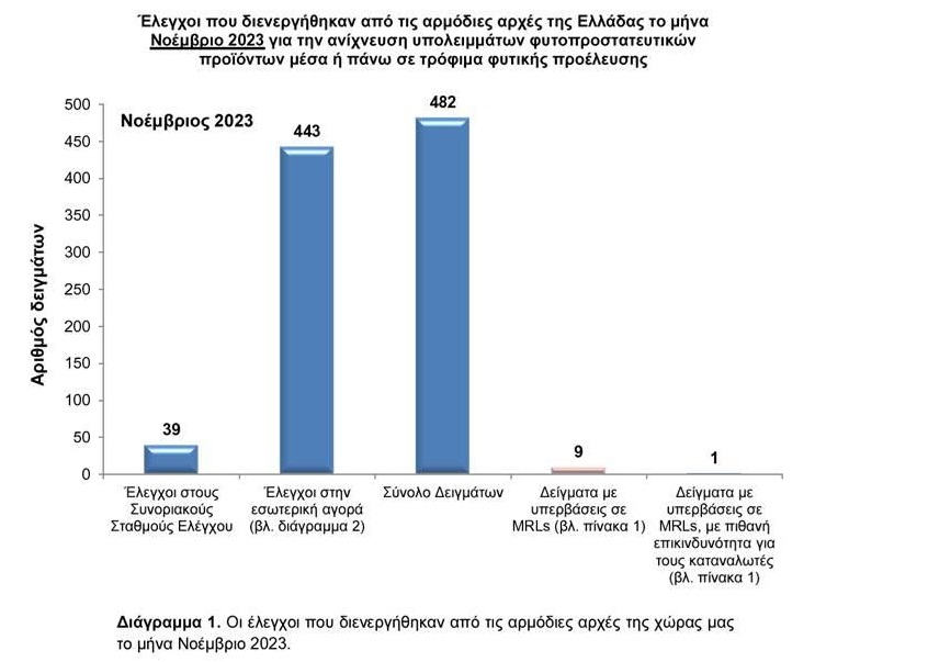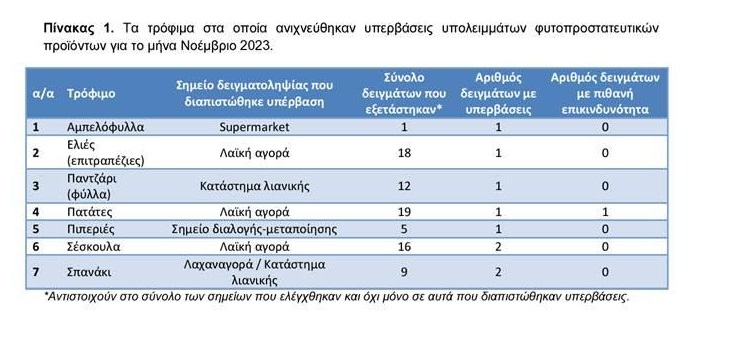 Οι έλεγχοι, σύμφωνα με τα στοιχεία από την Διεύθυνση Προστασίας Φυτικής Παραγωγής του ΥΠΑΑΤ, έγιναν σε αμπελόφυλλα (σούπερ μάρκετ), σε επιτραπέζιες ελιές, πατάτες, σέσκουλα (λαϊκή αγορά), σε παντζάρι (φύλλα), πιπεριές (σημείο διαλογής-μεταποίησης), σπανάκι (λαχαναγορά/κατάστημα λιανικής).