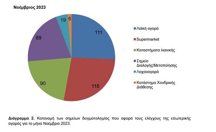 Σε ό,τι αφορά την εσωτερική αγορά, τον Νοέμβριο του 2023 πραγματοποιήθηκαν συνολικά 118 έλεγχοι σε Σούπερ Μάρκετ, 111 στις λαϊκές αγορές, 90 σε καταστήματα λιανικής, 89 σε σημεία διαλογής/μεταποίησης, 19 στη Λαχαναγορά και 6 σε καταστήματα χονδρικής διάθεσης.