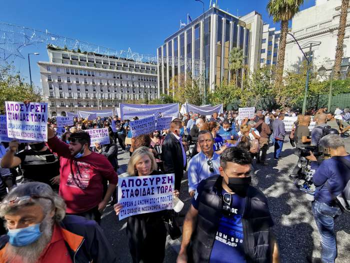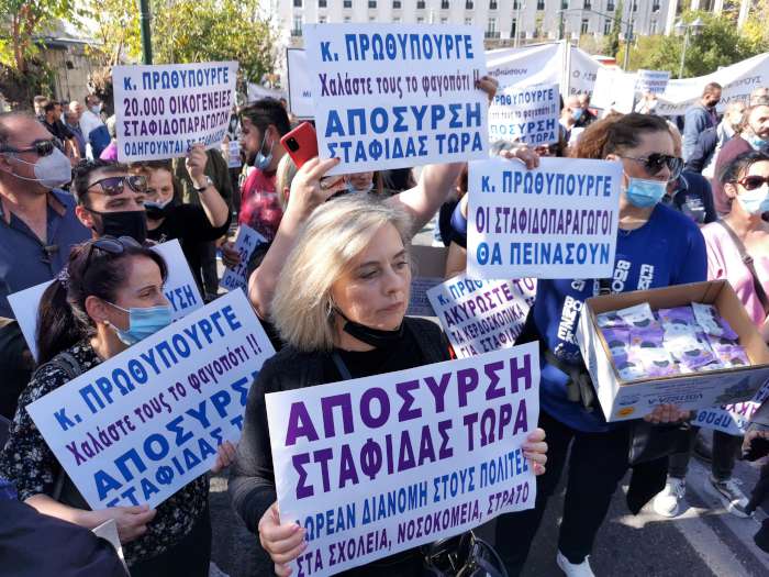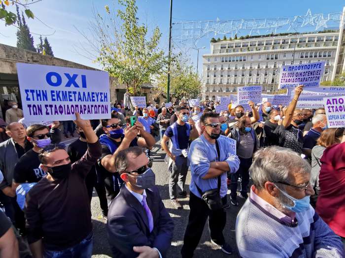Εκατοντάδες σταφιδοπαραγωγοί από όλα τα παραγωγικά κέντρα της Πελοποννήσου, μαζί με τους εκπροσώπους των οργανώσεών τους, βρέθηκαν σήμερα, Παρασκευή 5 Νοεμβρίου, νωρίς το μεσημέρι στην πλατεία Συντάγματος από όπου και ξεκίνησαν πορεία διαμαρτυρίας για τα ζητήματα που αντιμετωπίζει το προϊόν τους.