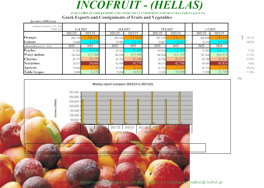 Σύμφωνα με τα στοιχεία της INCOFRUIT-HELLAS: «συνεχίσθηκε με καλύτερους ρυθμούς η συγκομιδή και εξαγωγή θερινών φρούτων και λαχανικών με τις μέχρι σήμερα ποσότητες μειωμένες -9.3% έναντι της αντίστοιχης περιόδου 2022: