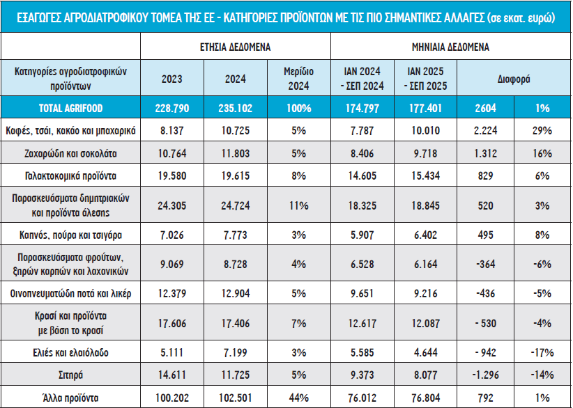 Οι εξαγωγές ζαχαρωδών και σοκολάτας αυξήθηκαν κατά 1,3 δισ. ευρώ (+16%), λόγω ανόδου 27% στις τιμές σοκολάτας, ενώ οι εξαγωγές γαλακτοκομικών αυξήθηκαν κατά 829 εκατ. ευρώ (+6%), κυρίως λόγω υψηλότερων τιμών σε τυρί και βούτυρο. Αντίθετα, οι εξαγωγές δημητριακών μειώθηκαν κατά 1,3 δισ. ευρώ (-14%), με μείωση των όγκων σιταριού (-19%) και καλαμποκιού (-25%), αν και οι όγκοι έχουν ανακάμψει από τον Αύγουστο πάνω από τα επίπεδα του 2024.