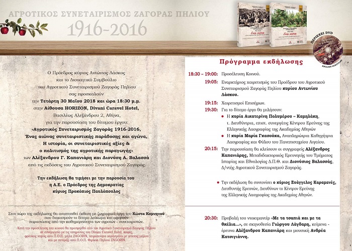 Στις 30 Μαΐου προγραμματίζει ο Αγροτικός Συνεταιρισμός Ζαγοράς Πηλίου, ευρύτερα γνωστός από το εμπορικό σήμα «ZAGORIN», την παρουσίαση του δίτομου έργου 1126 σελίδων «ΑΓΡΟΤΙΚΟΣ ΣΥΝΕΤΑΙΡΙΣΜΟΣ ΖΑΓΟΡΑΣ ΠΗΛΙΟΥ 1916 – 2016, Ένας αιώνας συνεταιριστικής παράδοσης και αγώνα, Η ιστορία, Οι συνεταιριστικές αξίες και Ο πολιτισμός της αγροτικής παραγωγής», στην πρωτεύουσα.