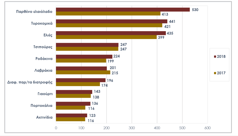 Σύμφωνα με την ανάλυση του ΙΕΕΣ, οι εξαγωγές του παρθένου ελαιόλαδου το 2018 ανήλθαν σε €530 εκατ. σημειώνοντας αύξηση κατά €117 εκατ., με τη μεταβολή αυτή να οφείλεται κυρίως στην ενίσχυση των εξαγωγών προς την Ιταλία (κατά €82 εκατ.). Παράλληλα, τα τυροκομικά προϊόντα συνεισέφεραν αισθητά στη θετική μεταβολή των εξαγωγών του κλάδου (αύξηση €20 εκατ.), ενώ τρίτο σημαντικότερο προϊόν αποτέλεσαν οι ελιές με μερίδιο 8,0%. Την πρώτη δεκάδα προϊόντων συμπληρώνουν οι τσιπούρες (4,6% μερίδιο εξαγωγών κλάδου), τα ροδάκινα (4,1%), τα λαβράκια (3,7%), διάφορα παρασκευάσματα διατροφής (3,6%), το γιαούρτι (2,6%), τα πορτοκάλια (2,5%) και τα ακτινίδια (2,3%).