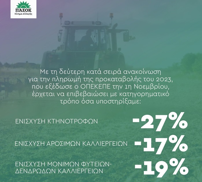 «Με τη δεύτερη κατά σειρά ανακοίνωση – διευκρινίσεις για την πληρωμή της προκαταβολής 2023 που εξέδωσε ο ΟΠΕΚΕΠΕ την 1/11/2023, έρχεται να επιβεβαιώσει με κατηγορηματικό τρόπο όσα υποστηρίξαμε ως ΠΑΣΟΚ Κίνημα Αλλαγής με Δελτίο Τύπου και τις δηλώσεις των στελεχών μας». Τα παραπάνω αναφέρονται σε σημερινό δελτίο τύπου που υπογράφει ο Αθανάσιος Πετρόπουλος, Γραμματέας του Τομέα Αγροτικής Ανάπτυξης & Τροφίμων του κόμματος.