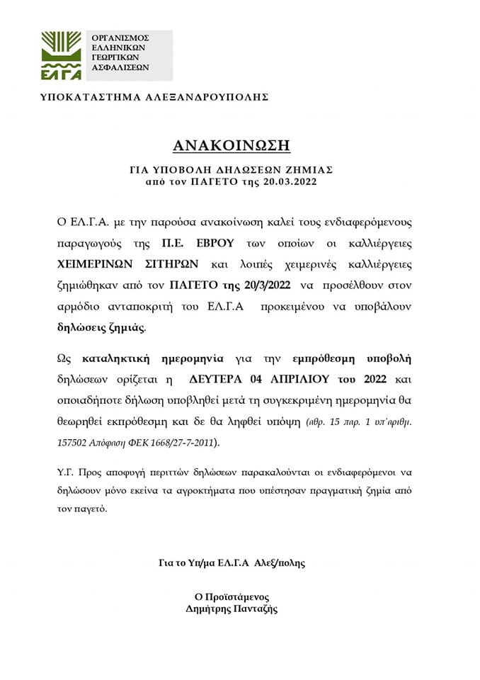 Σύμφωνα με ανακοίνωση που εξέδωσε ο ΕΛΓΑ καλούνται οι παραγωγοί σιτηρών και άλλων καλλιεργειών που υπέστησαν ζημιές από τον παγετό της 20ης Μαρτίου να προβούν σε υποβολή δήλωσης έως τη Δευτέρα 4 Απριλίου.