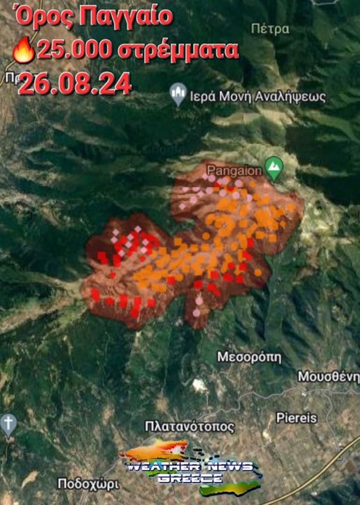 Εξακολουθεί να μαίνεται για 5η μέρα η φωτιά στο Παγγαίο Όρος, έχοντας κάψει περισσότερα από 12.000 στρέμματα δασικής έκτασης με χαμηλή βλάστηση. Για ένα ακόμη βράδυ το Παγγαίο ήταν παραδομένο στις φλόγες, με τις αναζωπυρώσεις της φωτιάς να είναι συνεχείς και τους δυνατούς ανέμους να τροφοδοτούν την πυρκαγιά.