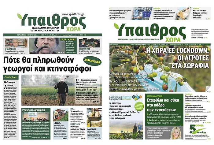 Συμπληρώνονται σήμερα πέντε χρόνια προσφοράς στην ενημέρωση όλων όσοι παρακολουθούν τις εξελίξεις στην ελληνική γεωργία, αλλά και τις διεθνείς εξελίξεις στον αγροτικό τομέα, από την εφημερίδα «Ύπαιθρος Χώρα» και την ιστοσελίδα ypaithros.gr.