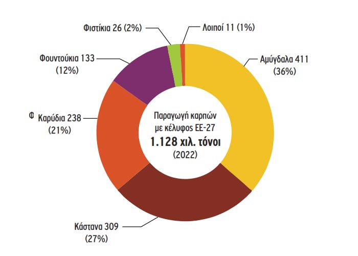 Στο σύνολό της, η παραγωγή καρπών με κέλυφος στην ΕΕ μειώθηκε το 2022 σε 1.128 χιλ. τόνους, παρουσιάζοντας πτώση ως προς το προηγούμενο έτος (-5%), σε συνέχεια εκείνης του 2021 (-6,5%).