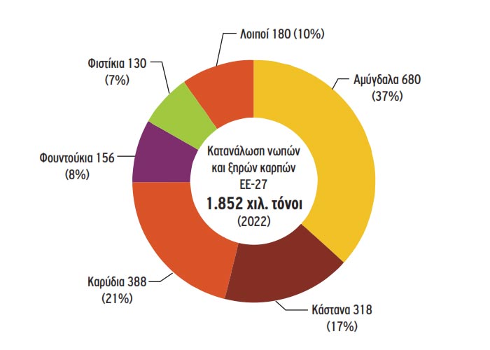 Τα αμύγδαλα, με όγκο 411.000 τόνων το 2022, καλύπτουν το μεγαλύτερο μέρος της παραγωγής καρπών με κέλυφος στην ΕΕ (36%). Ακολουθούν τα κάστανα, τα καρύδια και τα φουντούκια, ενώ πολύ μικρό μέρος αποτελούν τα φιστίκια (μόλις 2%). Πτώση, επίσης, παρουσίασε η κατανάλωση νωπών και ξηρών καρπών στην ΕΕ που περιορίστηκε το 2022 σε 1.852 χιλ. τόνους, παρουσιάζοντας μείωση ως προς το προηγούμενο έτος (-3,3%), κυρίως εξαιτίας της ανόδου των τιμών στα προϊόντα σε συνδυασμό με τις επιπτώσεις του πληθωρισμού στο εισόδημα των νοικοκυριών.