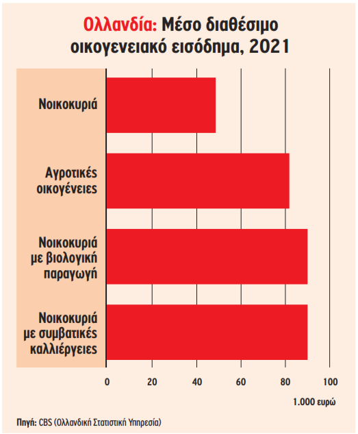 Κατά 10% υψηλότερο ήταν το μέσο οικογενειακό εισόδημα των ολλανδικών οικογενειών που ασχολούνται με επιχειρήσεις βιολογικής παραγωγής, έναντι των αντίστοιχων συμβατικών, όπως αναδεικνύουν νεότερα στοιχεία της Ολλανδικής Στατιστικής Υπηρεσίας (CBS). Βάσει αυτών, το εισόδημα του ολλανδικού νοικοκυριού με βιολογικές δραστηριότητες ανήλθε στα 90.000 ευρώ το 2021, όταν η μέση ολλανδική αγροτική οικογένεια είχε ετήσιο εισόδημα 82.000 ευρώ, έναντι των 49.000 ευρώ του μέσου ολλανδικού νοικοκυριού κατά την ίδια χρονιά.
